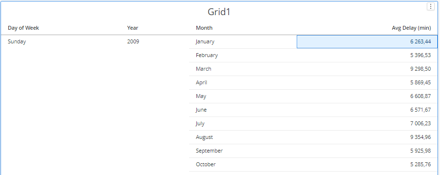 For example, if we set the metric parameter to mstrmojo.customviz.PICKED_TYPE.METRIC and select the data point representing the average delay on Sundays in year 2009 in the source visualization, all the graphics that contain some statistic values on Sundays of all the months in year 2009 are picked and highlighted in the target visualization. However, the graphic that contains statistic values of any airline in 2009 is not picked.