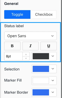 In the General format area, click Toggle. Select the colors for Selection, Marker Fill, and Marker Border for the toggle.