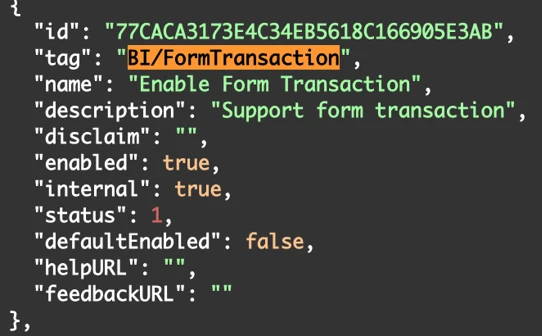 BI/formtransactionin the response body to find its status details. When the feature is inactive, it is set to 0. After it is activated, it is set to 1. -