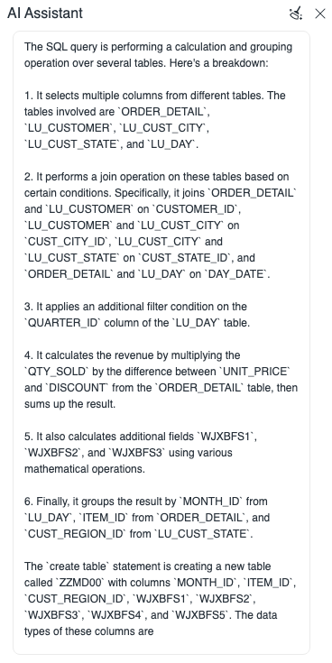 Auto SQL analiza el SQL y proporciona un resumen conciso de su consulta.