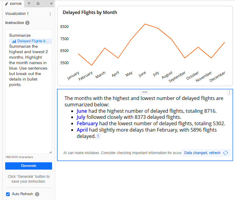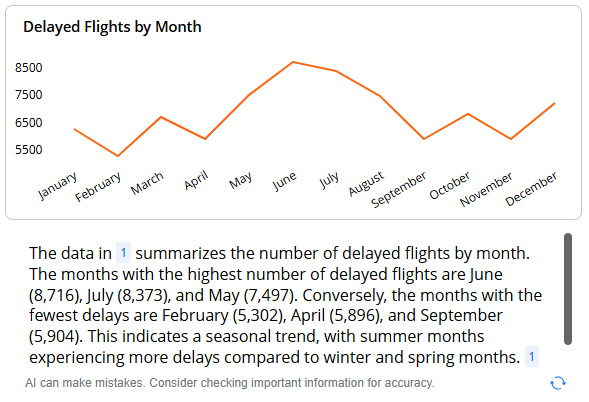 を選択し、自動ナラティブを作成を選択します。ビジュアリゼーションの一般的な概要が、新しいビジュアリゼーションに表示されます。以下に示すように、「月別の遅延フライト」折れ線グラフの概要には、遅延フライトの最多および最少の月がリストされ、季節的な傾向であるという洞察が含まれています。