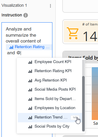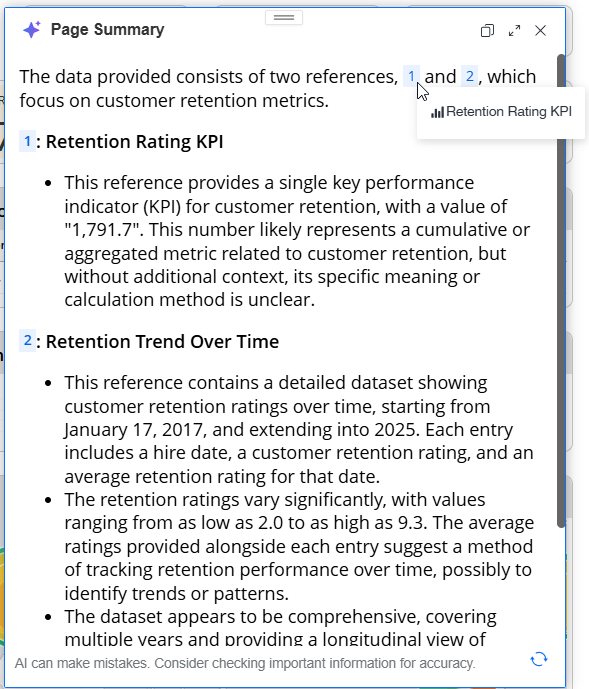以下の例では、指示が変更されて、Retention Rating KPI と Retention Trend Over Time の 2 つの視覚化のみを分析および要約するようになっています。