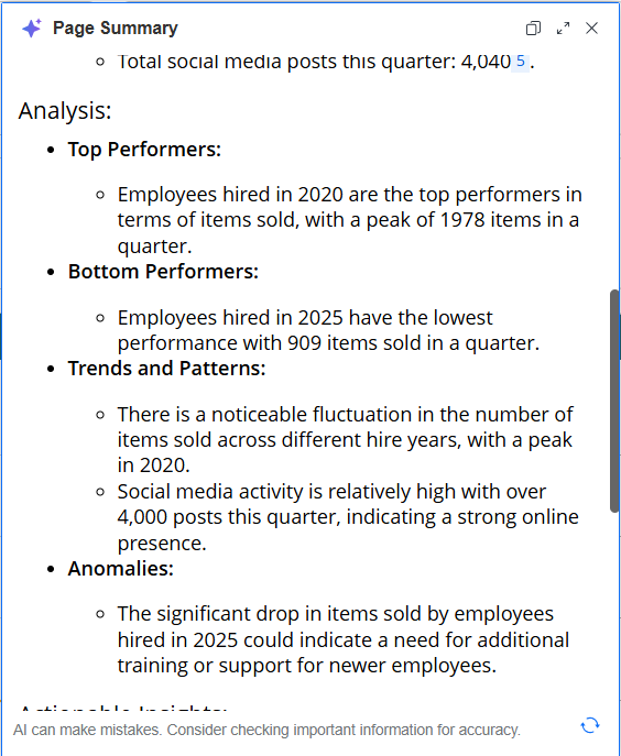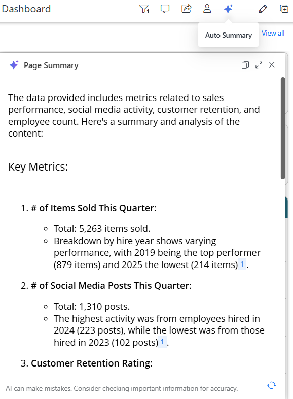 ビジネス ユーザーは、ダッシュボード内で直接 Auto Narratives を表示できます。ページの主要なインサイトの簡潔な自然言語サマリーとして表示されます。これらのページ ナラティブは、ダッシュボード作成者によって作成および設計され、基になるデータと適用されたフィルターに基づいて、ビジネス ユーザーに最も関連性の高い情報を提供します。サマリーは、ユーザーがダッシュボードと対話するときに動的に調整され、最新で最も関連性の高いデータへのアクセスを確保します。