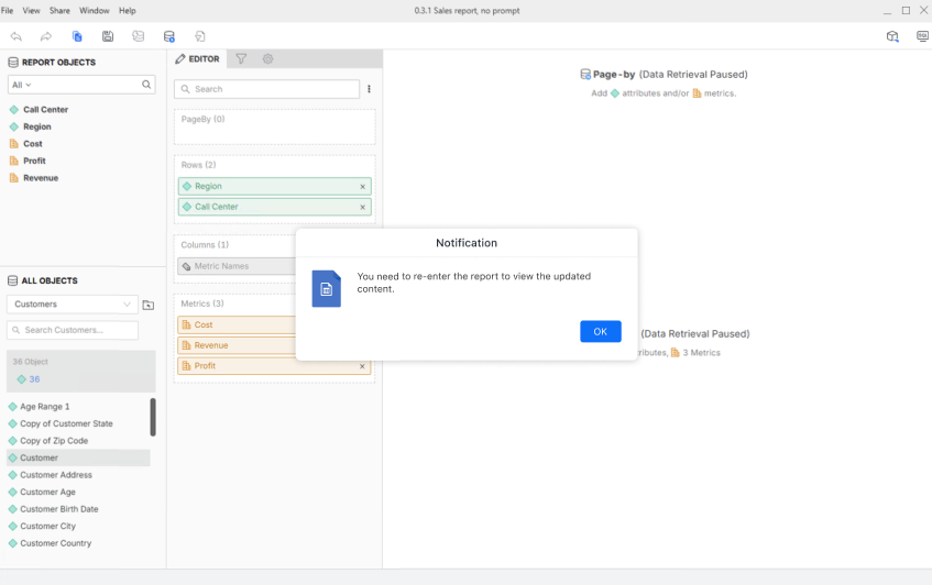4. 更新されたコンテンツを表示するには、レポートを再度開くよう通知が表示されます。