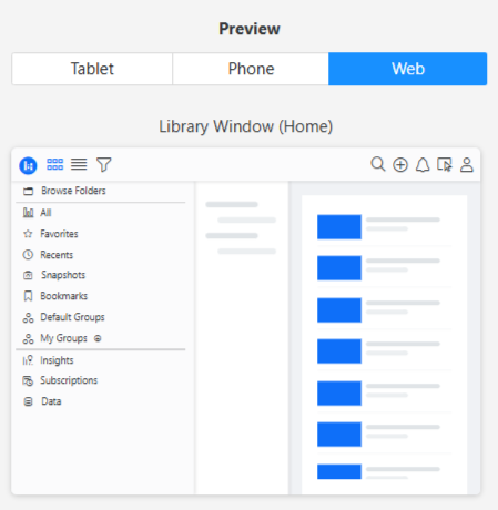 を使用プレビュー画面の右側にをクリックして更新を表示しますの間を切り替えタブレット電話、、およびWeb必要に応じて表示できます