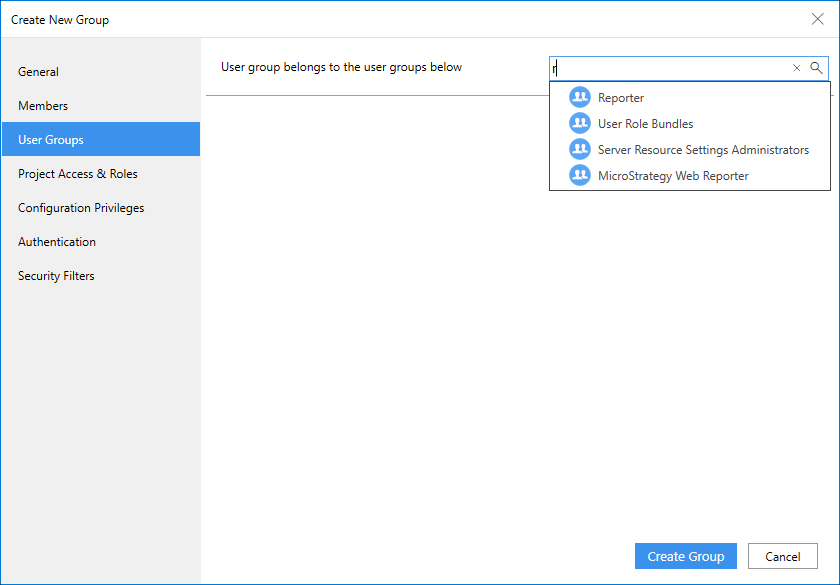 用户组选择您想要分配用户到的组。用户从组继承权限,以及从分配给该组的安全过滤器继承任何安全过滤器限制。