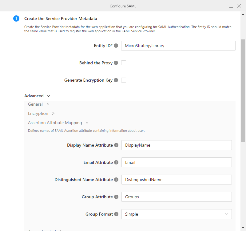 - 在步骤 1 中配置 SAML工作站对话框,展开先进的然后访问控制菜单选项并输入 Azure 传输 GUID 组信息管理组。